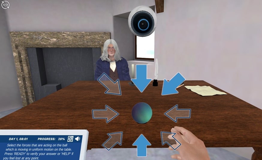 Traveling back in time and going into space has never been easier! I’m sure Newton will be surprised to see you in his room. He is quite upset since while he was working under a tree, an apple fell on his head and made him forget his first law of motion. Luckily you will join him in 1687 and with Dr. One you’ll help him remember everything about his law.