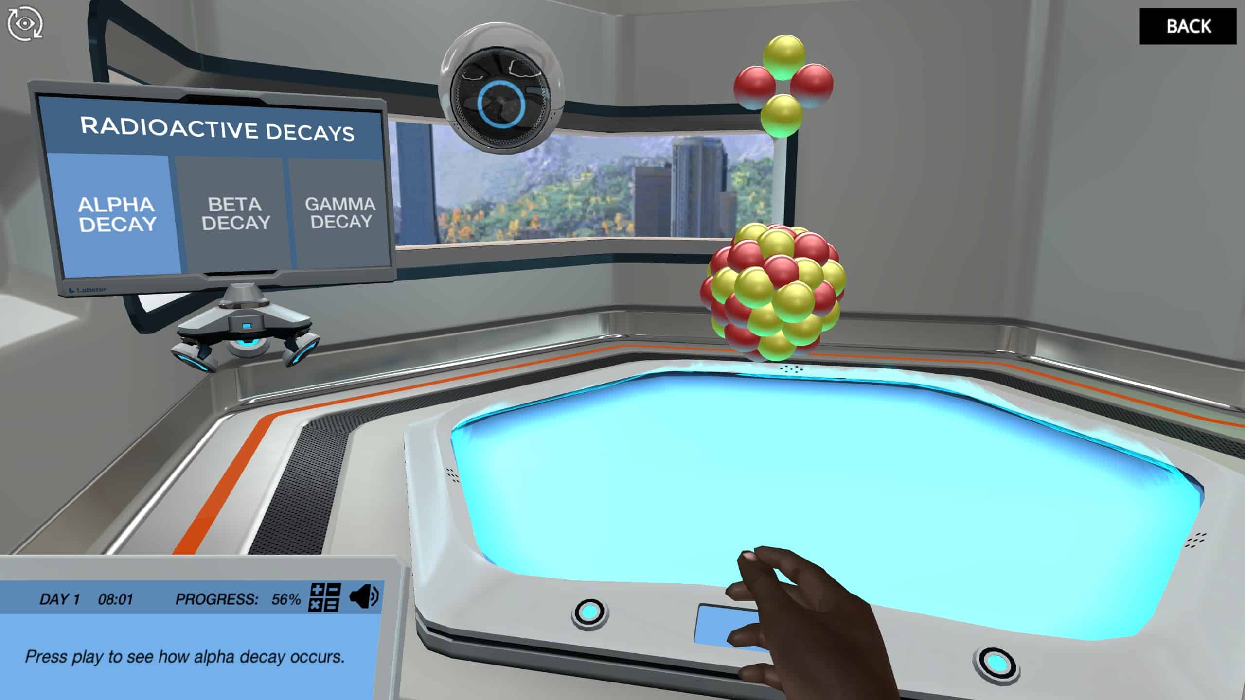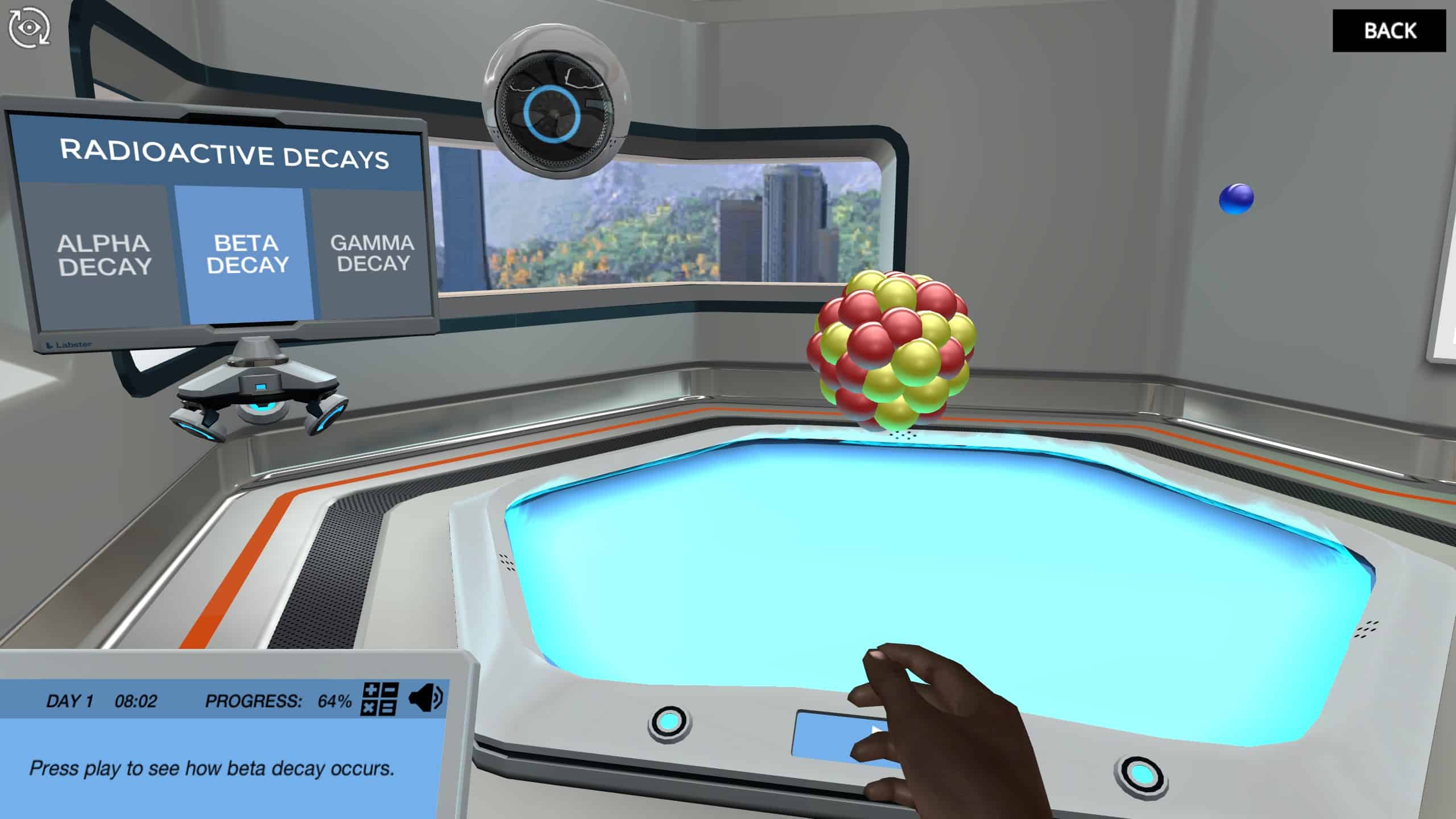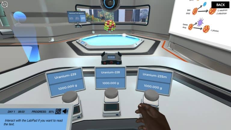 放射性同位素可以经历衰变、衰变和衰变。每一个过程都会产生放射性;幸运的是,我们是在一个虚拟的模拟中,我们可以用这些同位素做实验,而不会暴露在有害的辐射中。此外,你将能够看到质子和中子如何在原子核中相互作用,这要感谢我们先进的全息地板。
