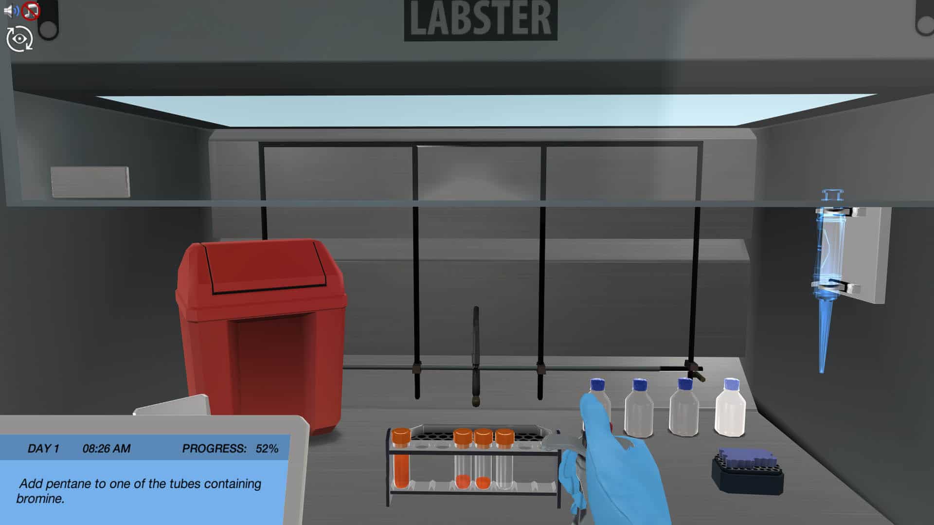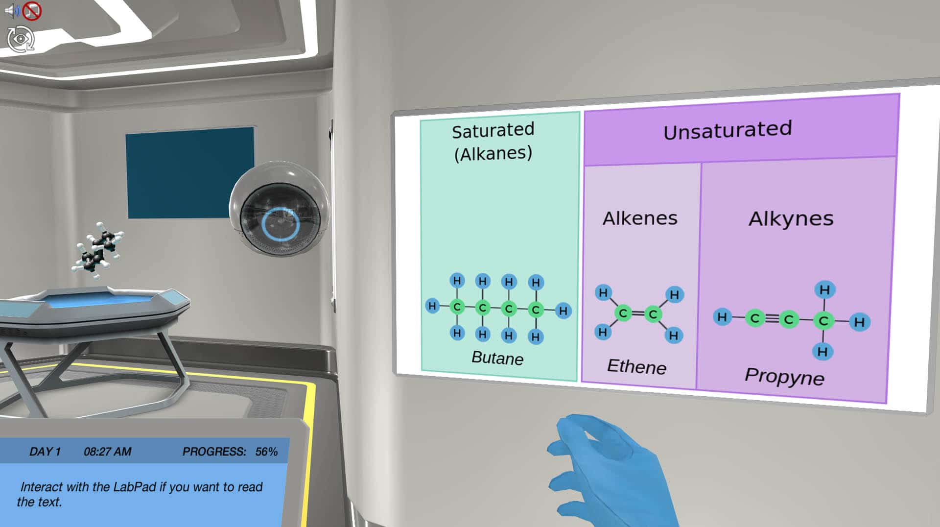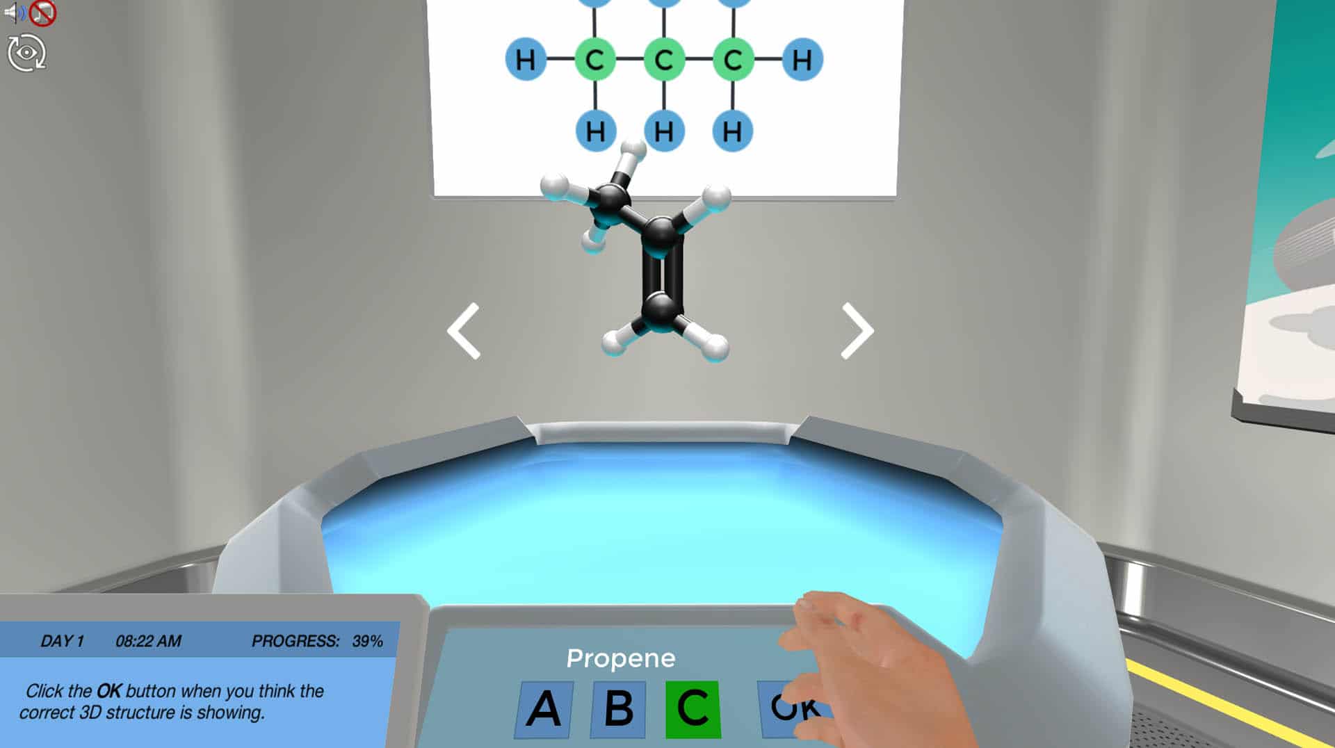 The lab focuses on a high level of interactivity. When working with types of carbon bonds and their angles, you get to build your own 3D carbon molecules on our holotable. In the fume hood, you can make mistakes with the hazardous solutions without consequences, and become comfortable with the equipment we use. Quiz questions on-the-go ensure that you learn the essential points. You can also always look at the Theory pages to extend your knowledge further.