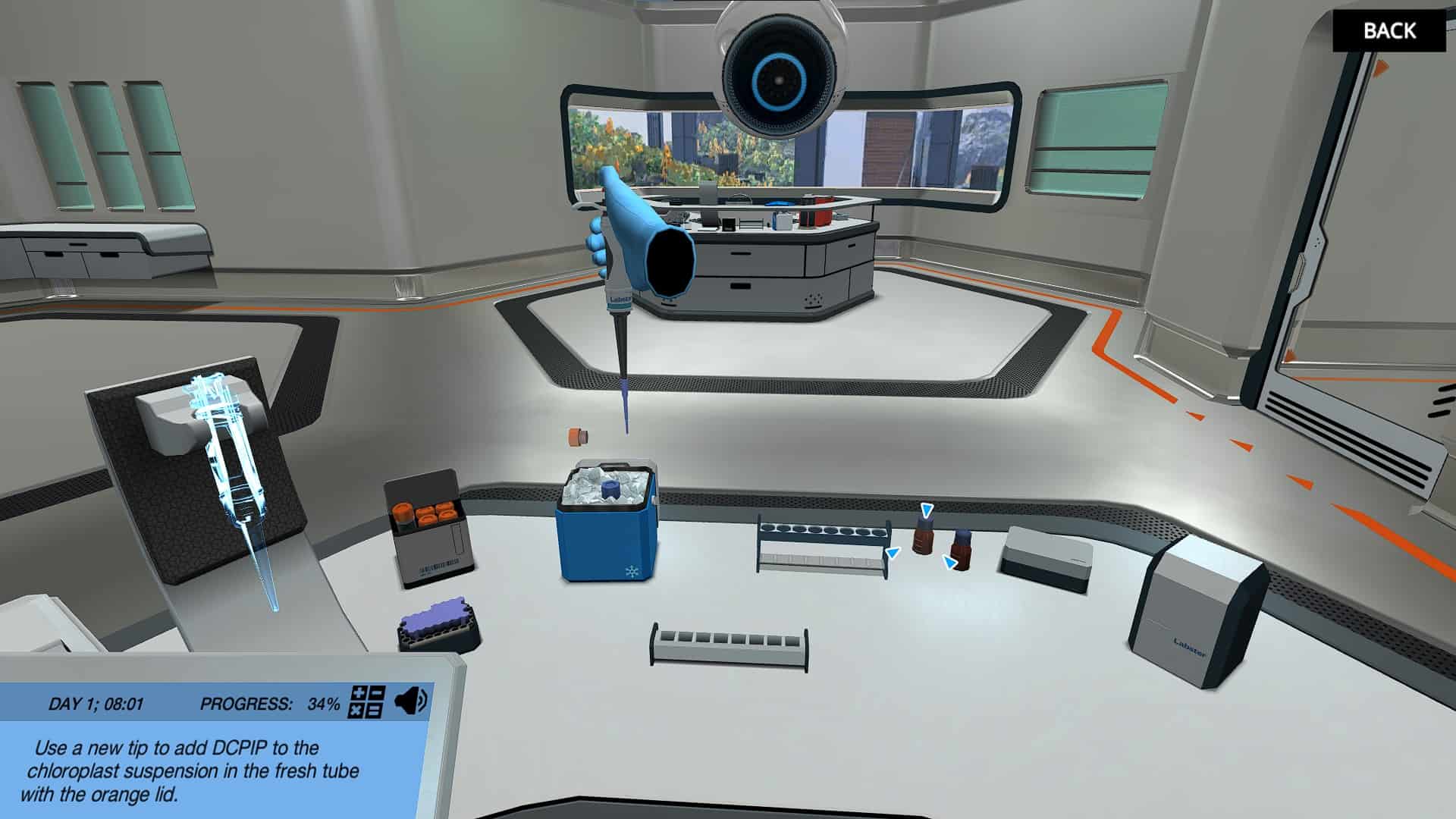 Our handy virtual assistant Dr. One has already extracted pigments from the algae for you! Now, to check out if the pigments can use green light for photosynthesis. In order to properly test your hypothesis, you will need to prepare and measure your sample, as well as positive and negative controls. Look at the absorption spectra from previous experiments to choose the correct wavelength of light for the spectrophotometer to measure your samples.