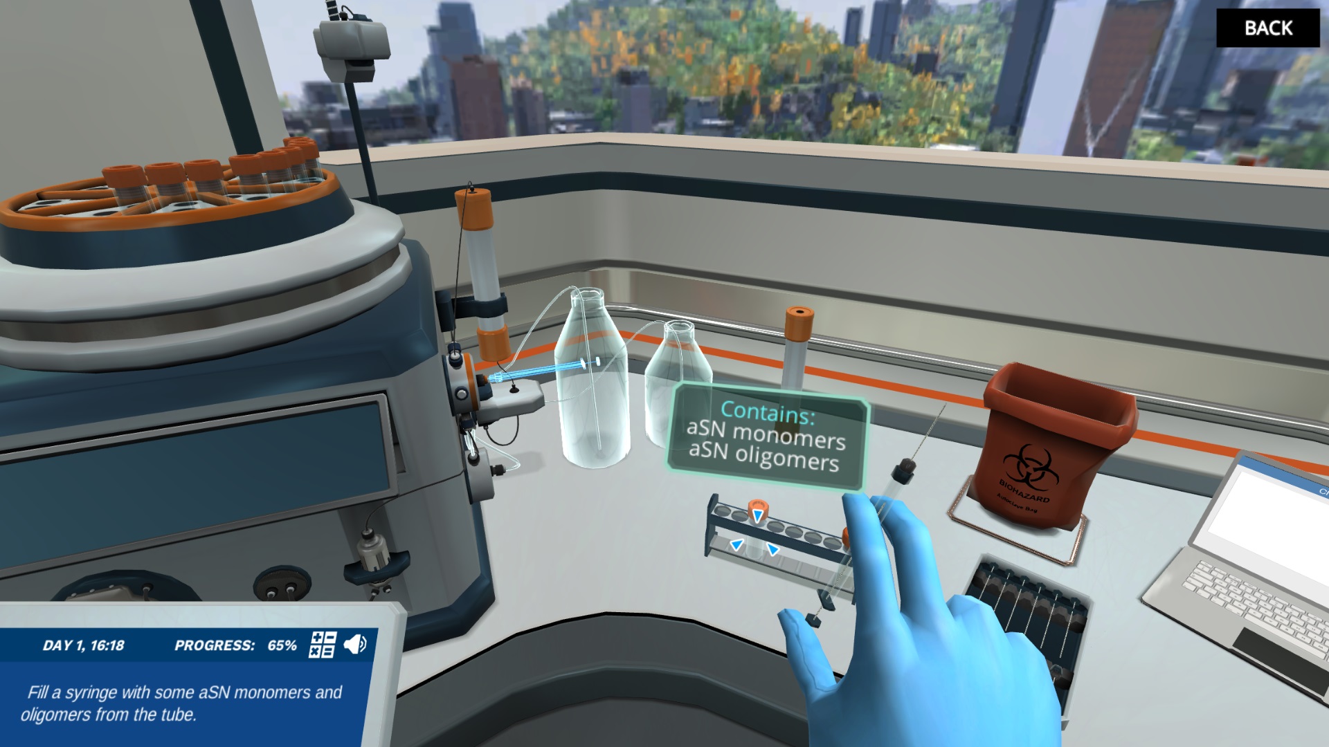 您将学习α -synuclein (aSN),这是一种在帕金森氏症发展过程中参与脑路易小体形成的蛋白质。为了开始处理aSN,你将首先使用超声波提取蛋白质,这是由一个大肠杆菌菌株,你的实验室助理之前对它进行了基因改造。然后,您将了解液相色谱仪器的不同部件,如进样器、捕分器、色谱柱等,以便在实际实验室操作设备之前对其进行熟悉。