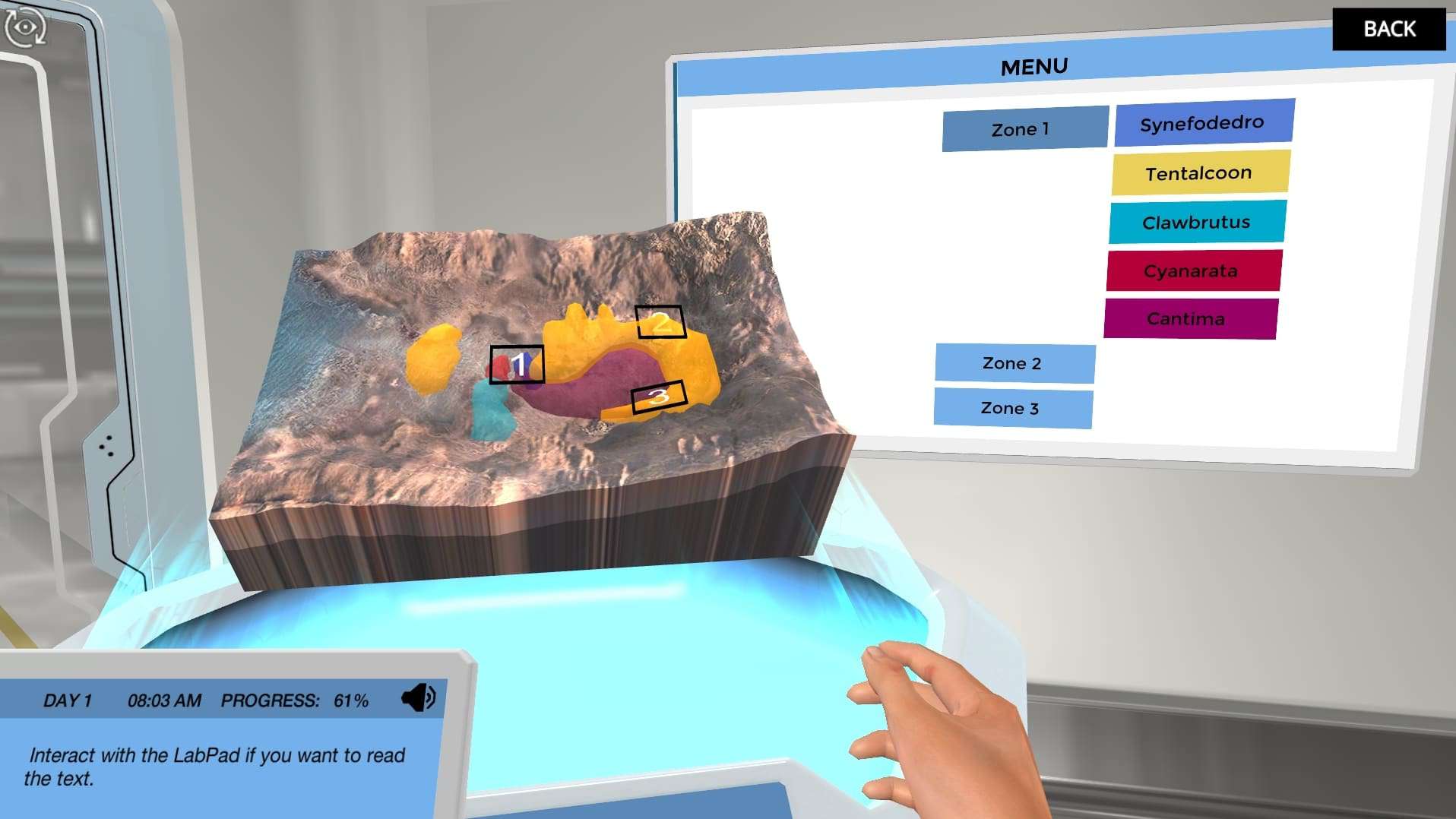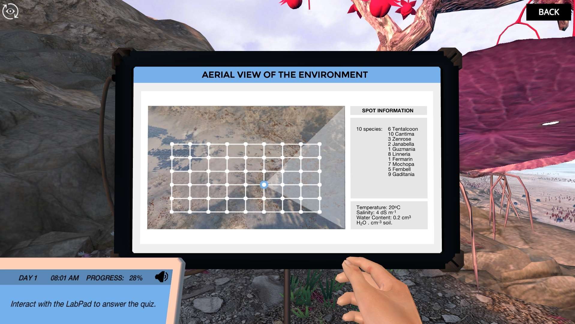 You will collect field data from the species and environmental variables and transfer them to the Labster holo-table. On the holo-table you will be able to analyze all the information you have gathered by using map layers analysis on a 3D holographic model of the terrain you are investigating. You will also analyze the distribution of different variables, and even be able to track the location of many different species in the area!