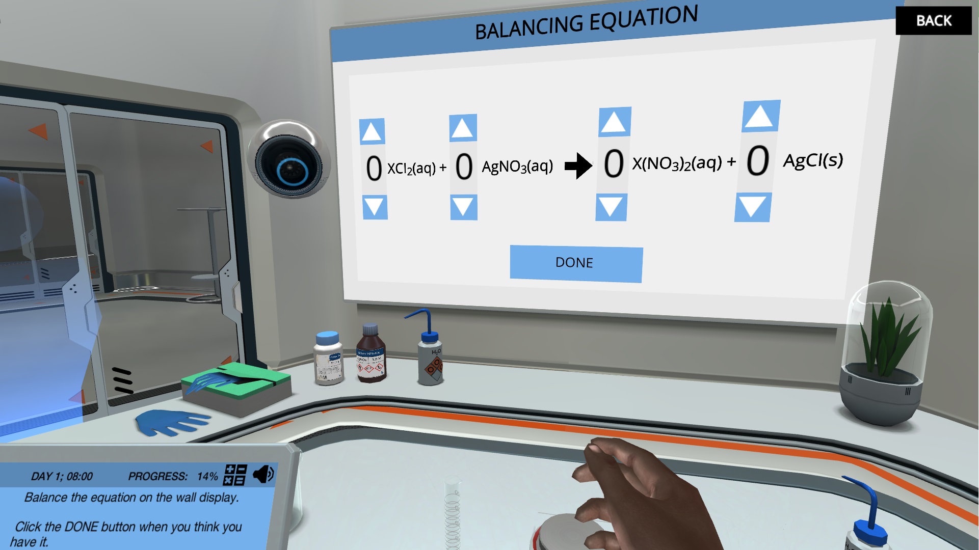 在这个简短的模拟中,你们的第一个任务是准备用于重力分析的化合物。用配平的化学反应方程式制备化合物,进行沉淀反应。记得在您的虚拟实验室日志中记录一切并解决谜题!