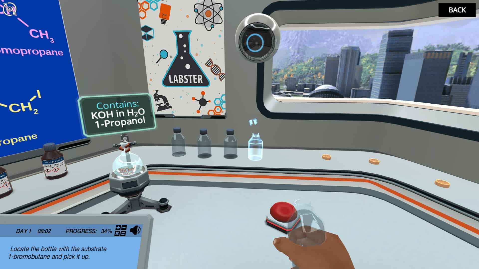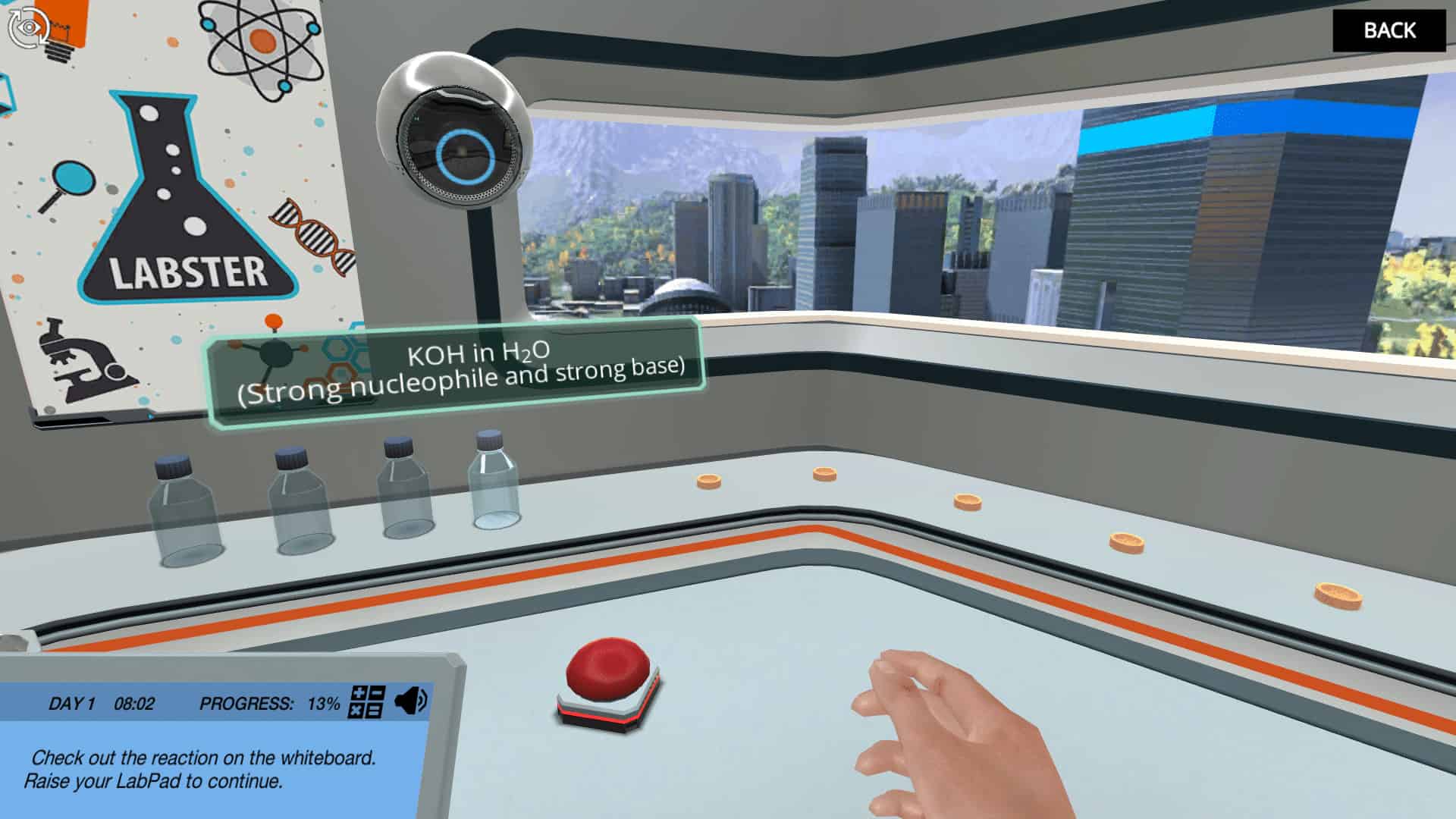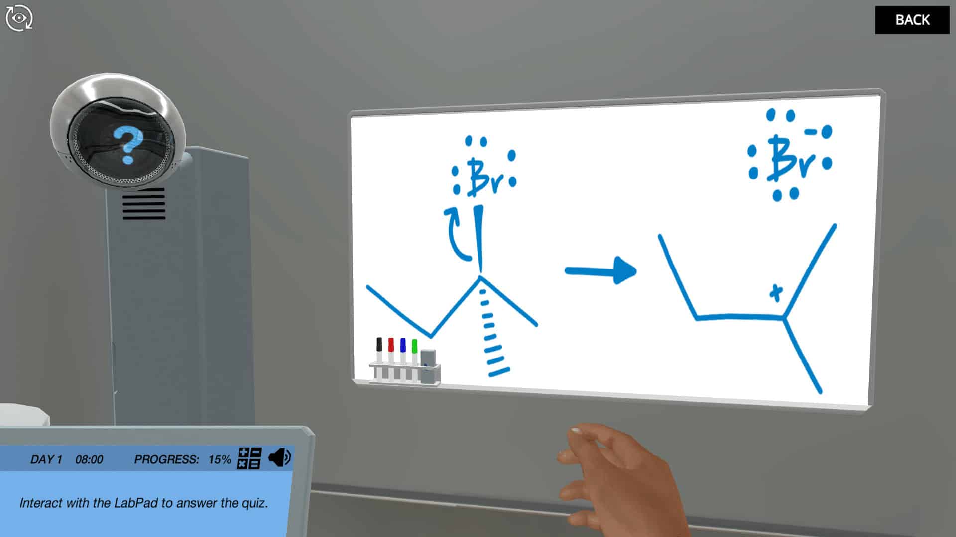 你们在这个模拟实验中的主要任务是解决一系列围绕替换和消除反应的挑战,由你们的虚拟实验室助理Dr. One给出。你将从复习反应知识开始,复习SN1, SN2, E1和E2反应。然后,您将进入主实验室,在那里,您需要解决挑战的化学材料等着您。