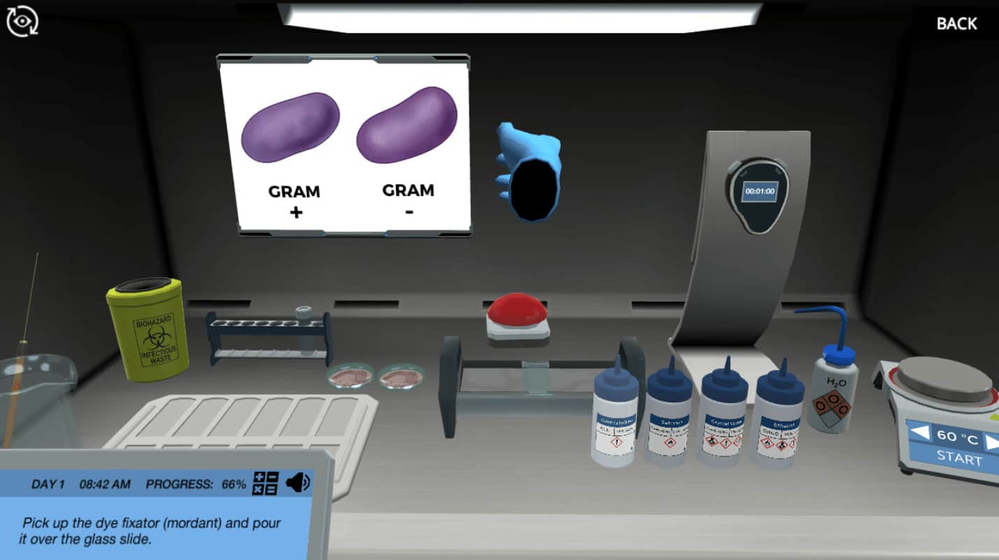 当病人的液体样本到达实验室时,要准备好防护装备,准备细菌涂片,并将其加热固定在一个玻片上。现在可以在安全的虚拟环境中执行革兰氏染色了。犯了一个错误?不用担心,按下工作台上的红色大按钮,重复染色过程,直到它成为第二天性。