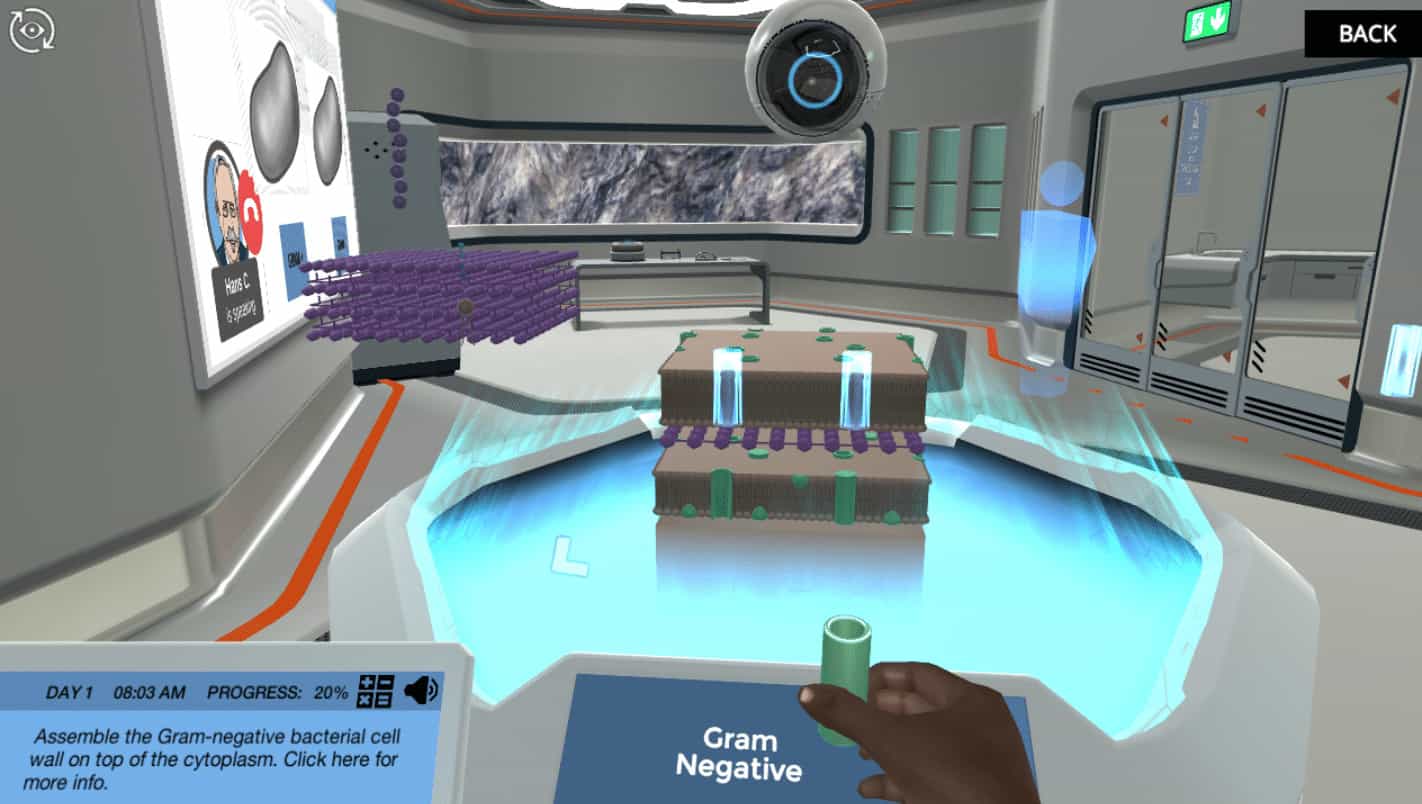 通过在全息图台上建立你自己的细菌3D模型来比较和对比革兰氏阳性和革兰氏阴性细菌的细胞壁。进入探索舱,在沉浸式动画中观察革兰氏染色剂的四种试剂如何与细胞壁的结构成分相互作用,为细菌染色。