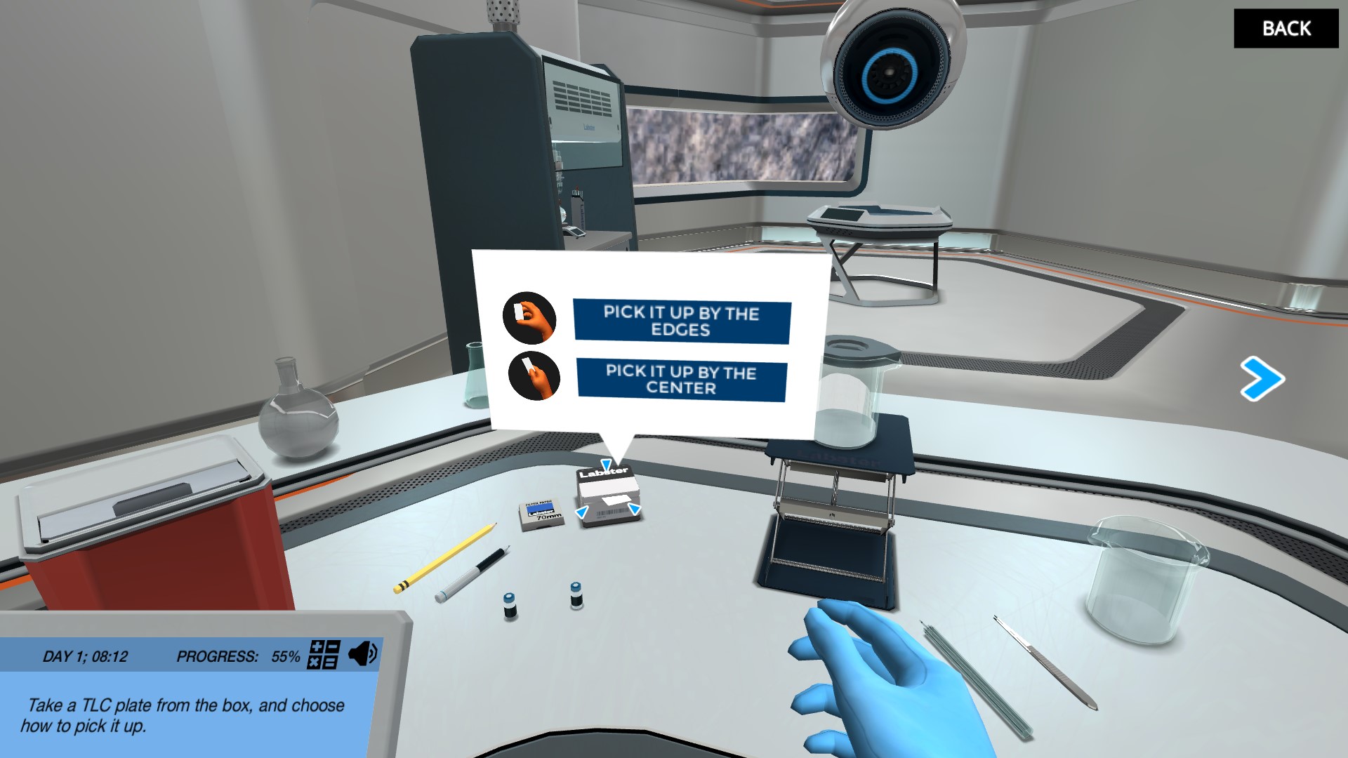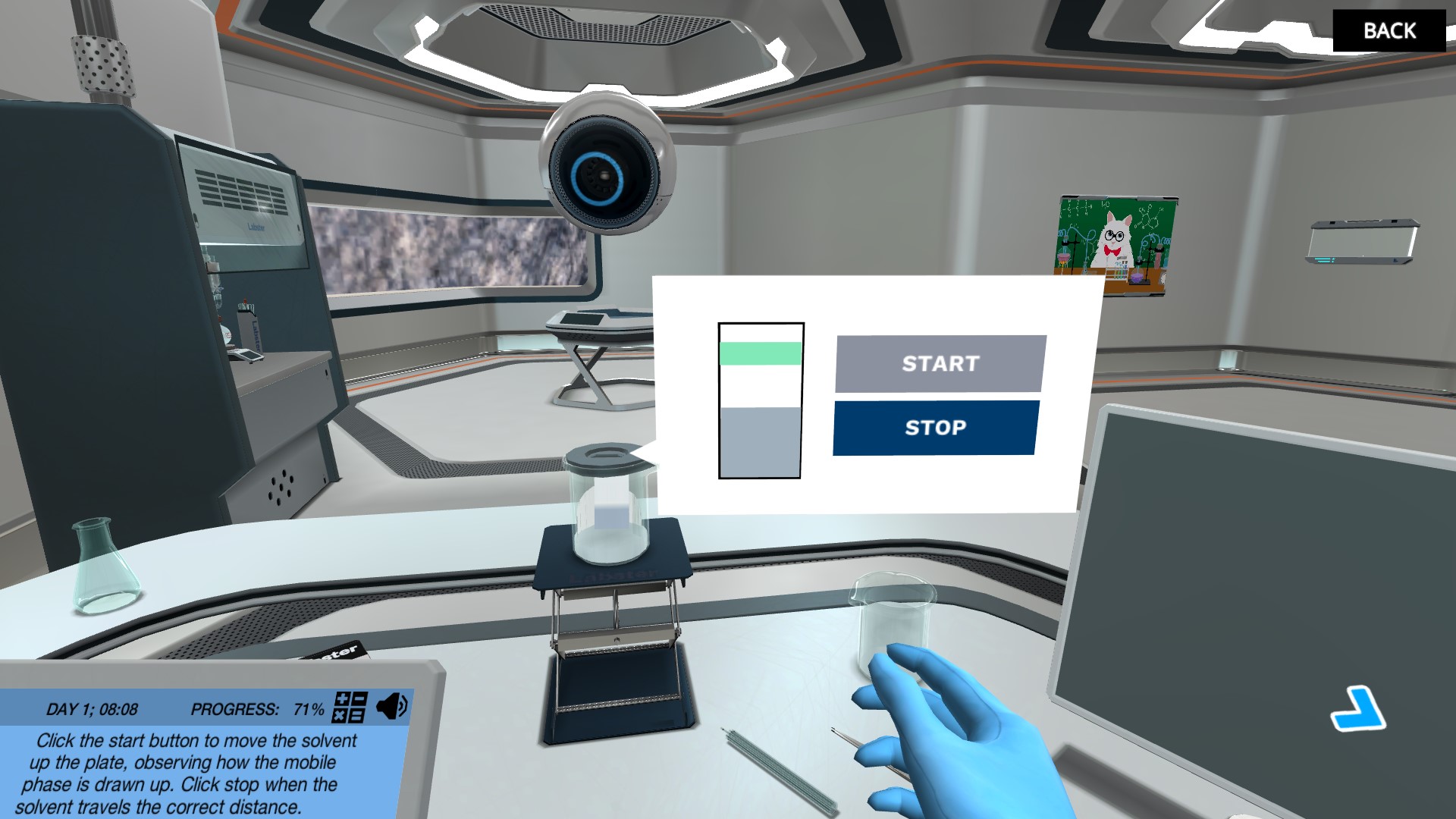 一旦你计算出了正确的溶剂比例,就可以开始工作了。组装并运行您自己的TLC实验,以监测反应的进展。选择合适的仪器,实验如何处理和放置板,并正确地将样品定位在固定相上。你能在正确的时间成功地从腔室中取出盘子吗?在你完成实验之后,在紫外线灯下分析你的薄层色谱板,确定什么时候反应已经完成。虚拟实验室再次节省时间,见效快!然后通过测量光斑移动的距离来计算Rf值。你能成功地分析你的结果,并计算出反应在什么时候完成吗?