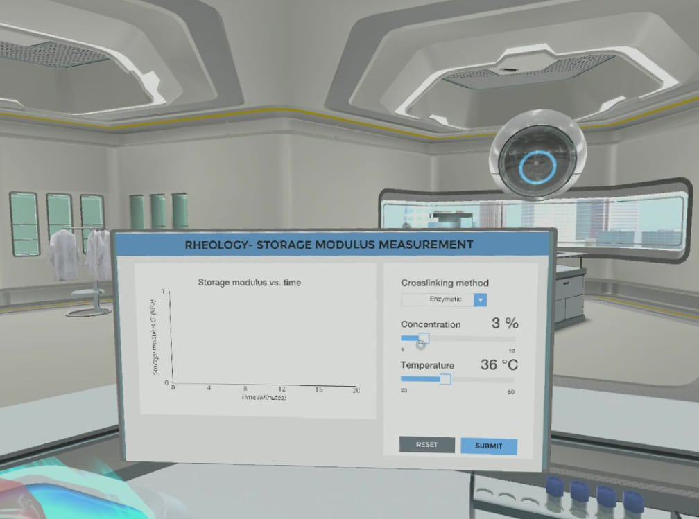 Finally, you will have obtained several hydrogels scaffolds that have been created using different crosslinking methods. Using a rheology approach, you will analyze the mechanical properties of each hydrogel. This virtual lab is equipped with a rheology simulator which will enable you to experiment with a various combination of parameters such as crosslinking method, polymer concentration, and temperature. In the end, you will have to decide which combination of polymer and crosslinking method is most suitable for the articular cartilage replacement. Will you able to ease the soccer player’s suffering?