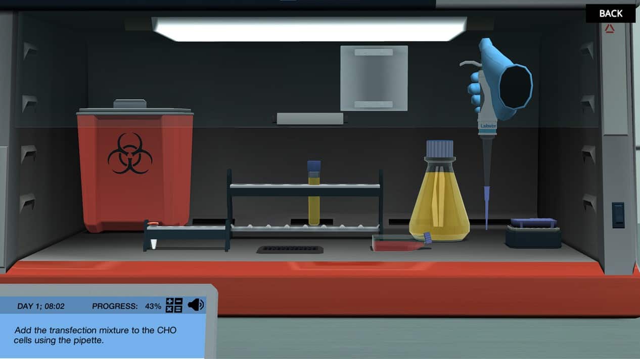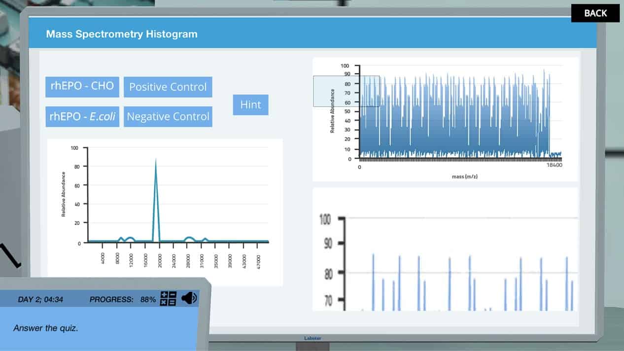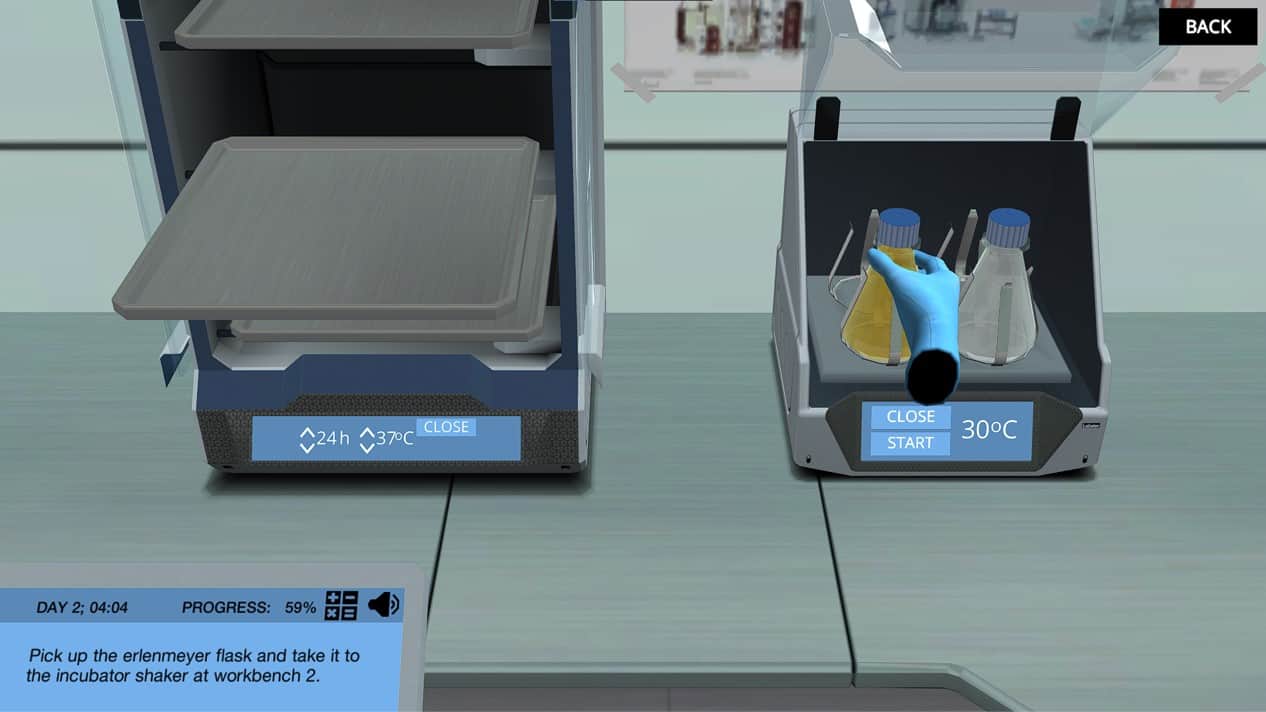 您在实验室中的第一任务将是制备转染成大肠杆菌和CHO细胞的重组人促红细胞生成素(Rhepo)。准备生物安全柜内的两个样品,然后将样品置于培养箱中。在虚拟实验室中,我们可以加快孵化时间,因此此步骤需要几秒钟而不是小时。我们的帮助实验室助理将在查看Repo的综合时净化样本。